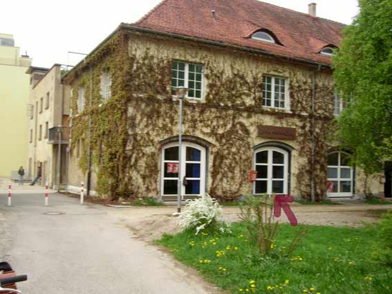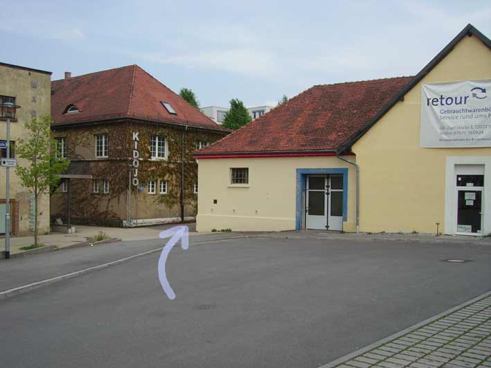 Wir arbeiten in den Räumen des Zirkus Zambaioni. Ein sehr schöner Raum mit Fußbodenheizung und viel Licht. Das Gebäude steht etwas versteckt. Kidojo ist unter dem Dach untergebracht und steht groß auf der Seite des Hauses. Hier von der neuen Stuttgarterstraße aus gesehen. |