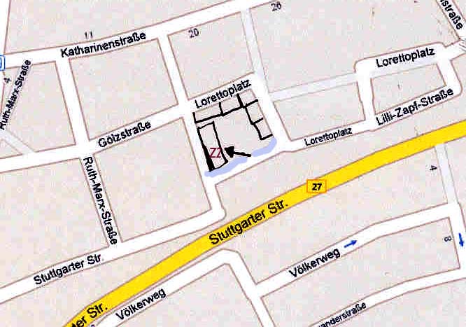 Wegbeschreibung zum Ort unserer Tanzkurse, jeden Dienstag, Abends LORETTOVIERTEL in Tübingen, Z 2, Lorettoplatz 2